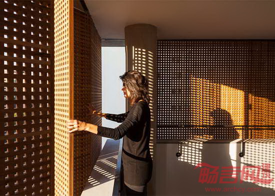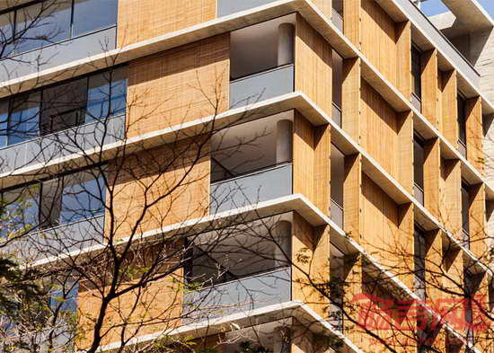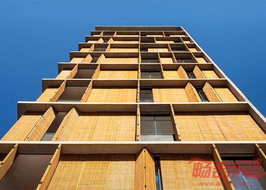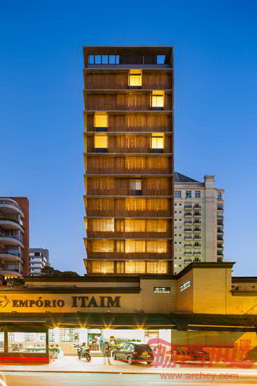 MK27工作室设计了位于巴西圣保罗的Vitacon Itaim公寓。建筑的一大特点是北立面设有穿孔木窗,北侧是最需要遮阳的朝向,住户可自由控制起居室的采光。项目坐落于圣保罗Chacara Itaim街区,包含10套公寓。多数面积为144平米,顶部有宽敞的复式住宅。设计师参考阿拉伯窗扉,设计出覆盖若干开口的木质百叶窗。这种窗扉最早被葡萄牙定居者带到巴西。