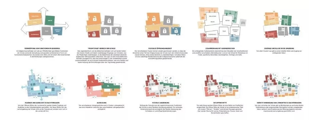 教育机构的业主是卡塞尔市政府,运营机构是卡塞尔市选定的学校。该项目总预算约为 3730 万欧元瓦尔岛开放学校新建筑、地区图书馆和青年中心的整体空间计划包括约 8,348 平方米的建筑面积,不包括附属区、建筑区和体育馆。C.F. Møller 在学校的平面布局中清楚地表明,这里将创建一座具有新空间特征的校舍,不再像早期的校舍那样将教室排成走廊,而是将学校的教育理念转化为空间布局。根据学生的年龄,在功能规划中定义了不同的空间要求。