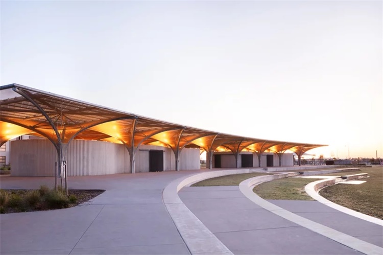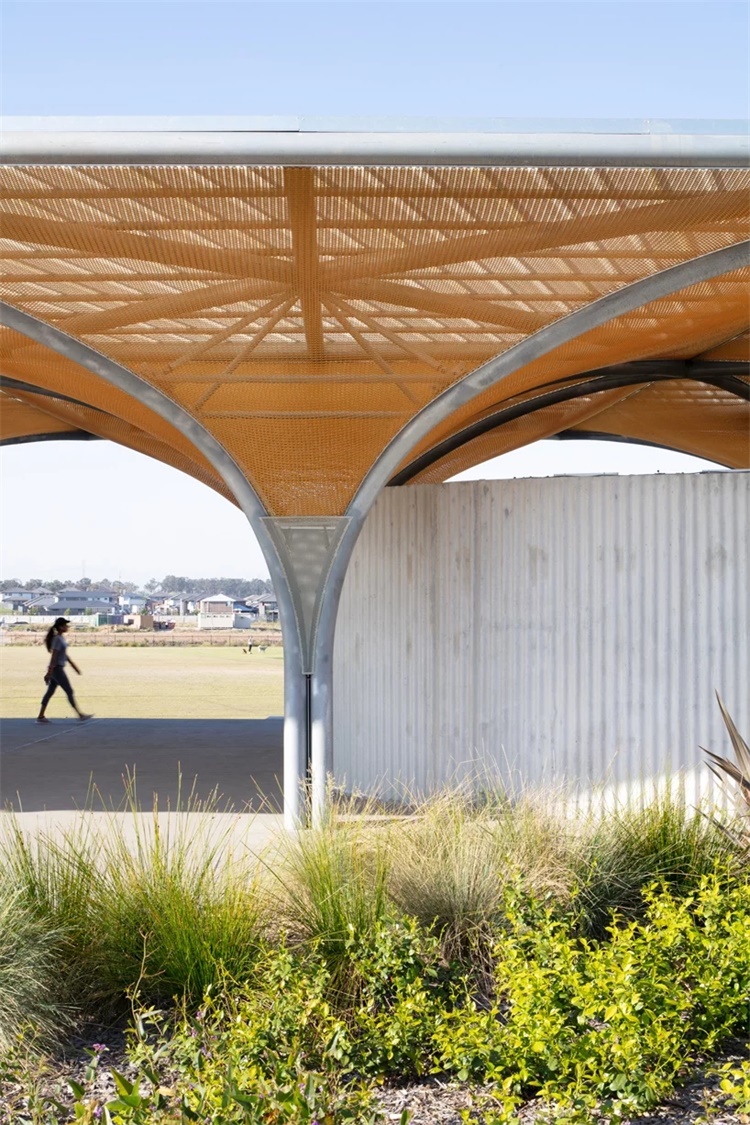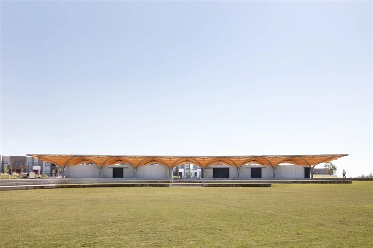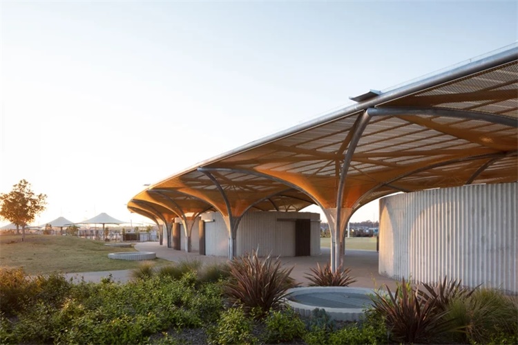 澳大利亚CHROFI工作室完成了Marsden公园社区中心的设计。项目坐落于悉尼,这项扩建工程将为运动队提供更衣室、设有顶棚的户外社区空间、亭台和公厕设施。借助这一竞赛优胜方案,CHROFI工作室探索了全新的结构方案,其内部产生了独特的空间特征,同时在外部提供了抽象、隐性的景观元素。CHROFI对Marsden公园便利设施的设计,表现了天棚和一层平面的负体积概念。项目景观部分由JMD公司完成,原始结构给人直接了当的印象,同时具有临时、有趣的空间特征。