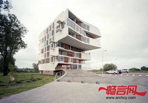 “可问题是,把这两个类型建筑的优点融合在一个建筑上可能吗?我们的解决方案是建造一个叠层公寓,让公寓和阁楼交替位于彼此之上,这样就做到了既能保有独户住宅的良好视野、隐私性好、生活空间大这些优点,同时又能保证经济费用低和维修费用较少,而且对环境的影响还很小。”