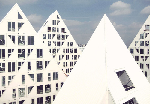 它以浮动冰山形状的结构得名——阳台的功能玻璃面板采用深蓝到透明色的过渡,有着闪闪发光的外表,让人联想到北极的冰山。地面是两层楼高的联排别墅,并集成到各种三角型建筑群中。