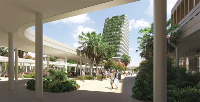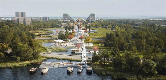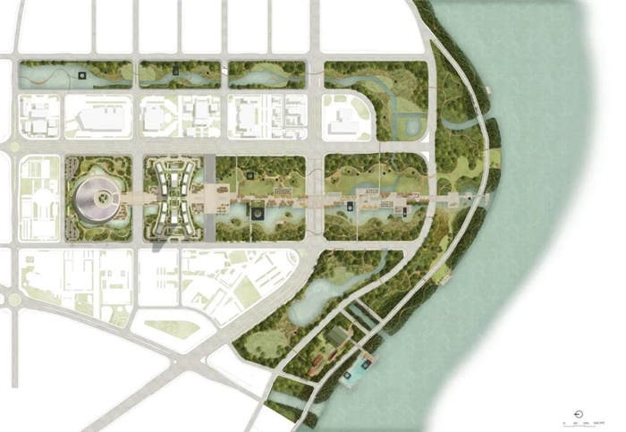 禁河北新城区(North CamRiver New Urban Area)开发项目沿南北中轴线展开,两侧将规划新的功能设施。在城市设计方面,一条长长的中轴线穿插景观公园,使北侧的两座新建筑与南侧河边的胡志明雕像相互呼应。