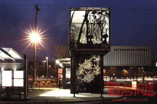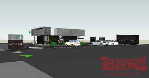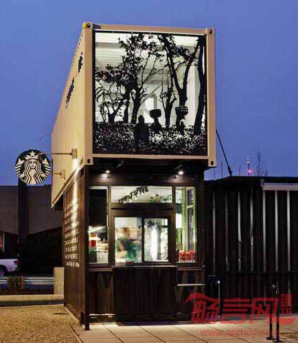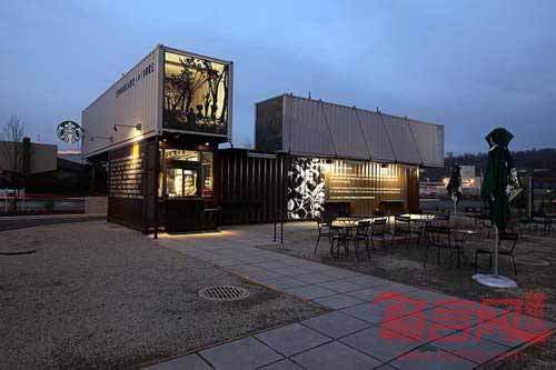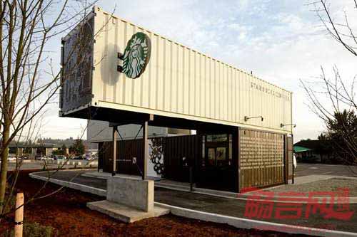 星巴克在美国西雅图市郊Tukwila区创建了一个免下车咖啡店,咖啡巨擎首次运用四个回收集装箱构成店铺。咖啡店背后的设计理念受咖啡来源渠道影响,咖啡和茶原料通过集装箱货柜,在全世界范围内进行运输。星巴克全球商店设计高级经理Anthony称,“我们选用回收材料建造免下车咖啡店,是源自于利用供应链中物件的愿望,譬如属于废弃物的旧集装箱。”
