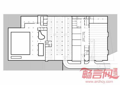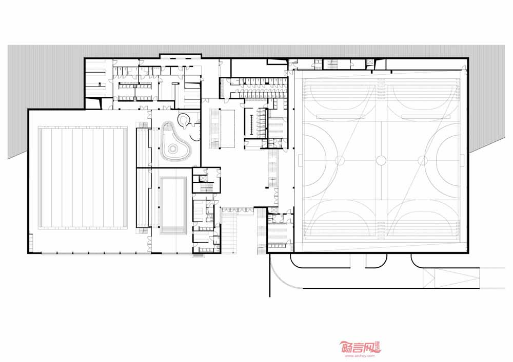 从体育中心的一层平面图看,体育场的结构非常简单。体育场一层区域由两个相同的方形区组成,其中一个包含了拥有正面看台的体操场,另一个涵盖了呈现“L”型的泳池及附属设施。两个区域相互独立,通过一个公共流通区连接。