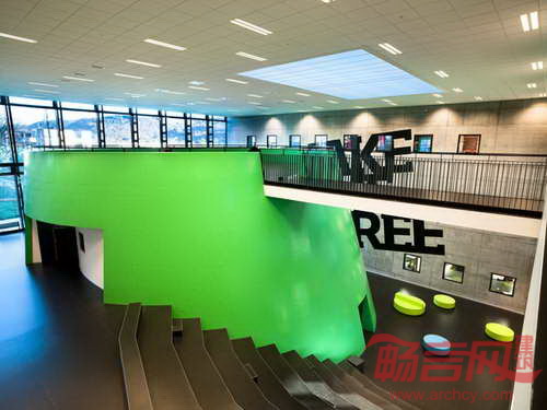 项目包含两座并排的建筑,一座容纳了体育设施,另一座涵盖了教育设施。建筑顶部设有铜质屋面,玻璃里面中彩色装饰板增添了生气。