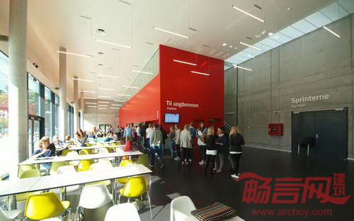 由于项目是挪威西海岸的卑尔根的学校,考虑到该地区的极夜特点和每年240天的雨季,设计师希望设计出适合学习和课外生活的理想场所。