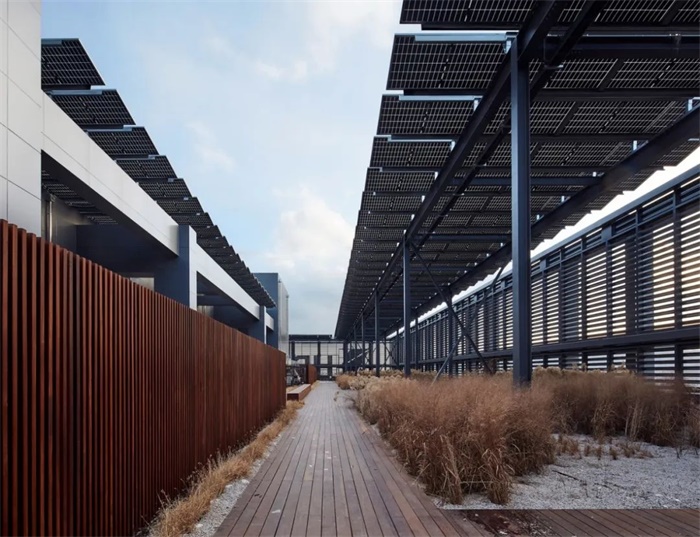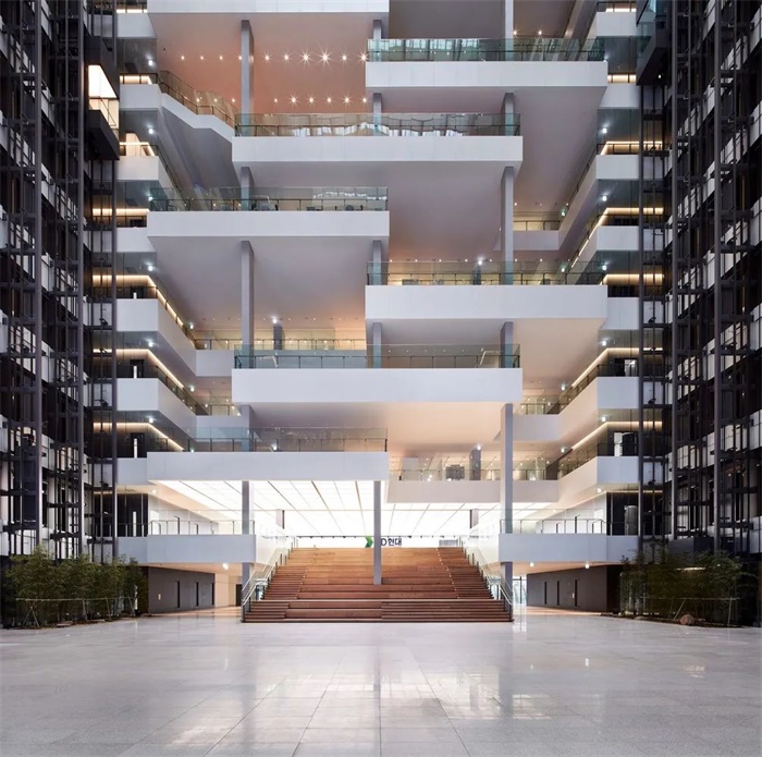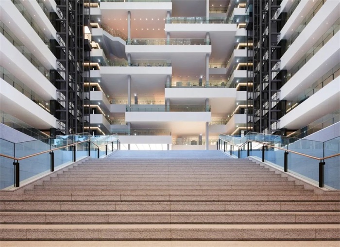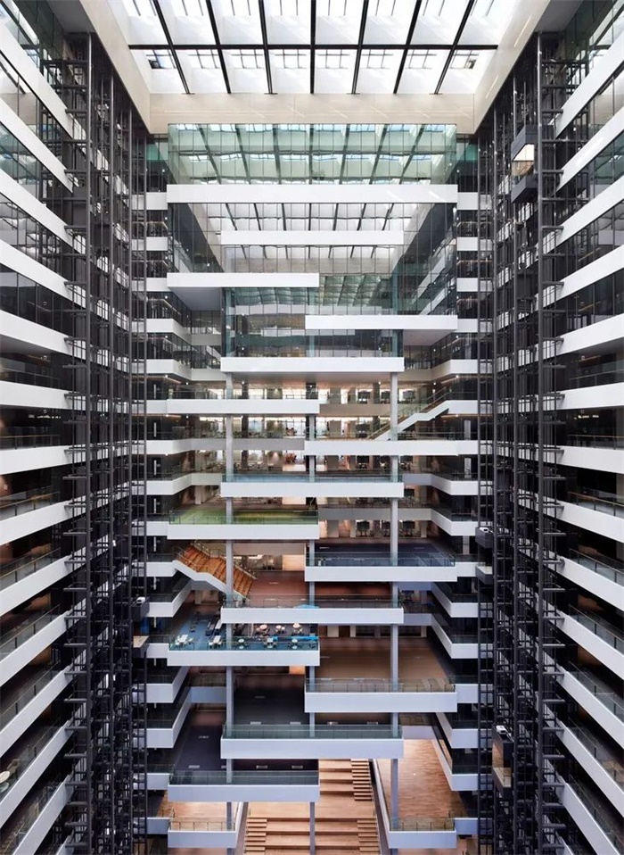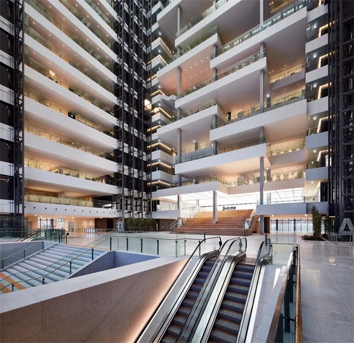 “智能空隙 SMART VOID”是建筑中连接整个设施的巨大虚空空间。它将 17 家集团公司联系在一起并促进交流,并通过自然采光和通风来降低能源消耗。一个连续的阶梯式沟通甲板面向虚空空间,促进信息交流。