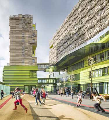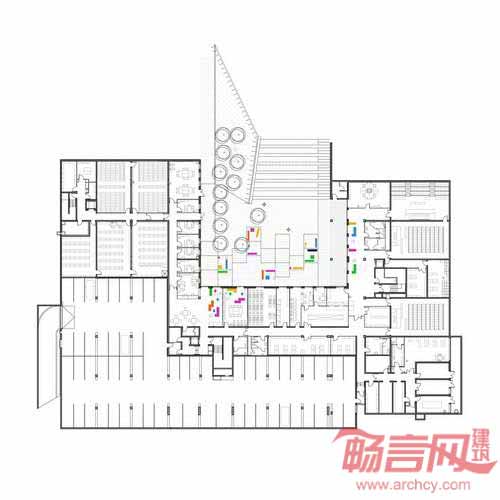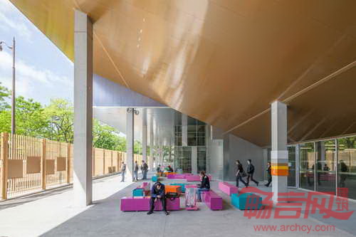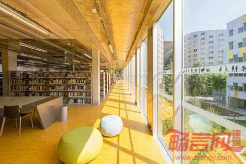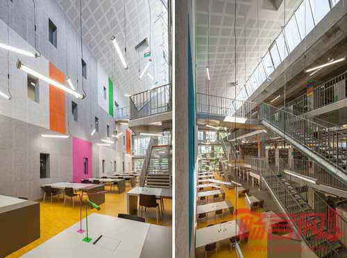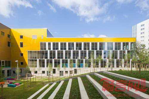 法国GPAA建筑事务所完成了巴黎索邦大学的Clignancourt中心项目的设计建设。项目为社会学、语言学和音乐学科学生提供资源,同时包含健身房、图书馆、500人大礼堂的公共功能空间。以上三大民用设施形成中心的三个立面,对照明显的材料凸显了功能差异。项目坐落于巴黎一块建筑密度较高的区域,运用引人注目的张扬色彩为单调乏味的城市景观注入活力。建筑的色彩运用有助于提供不同办公区域的空间向导。