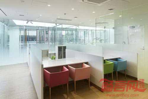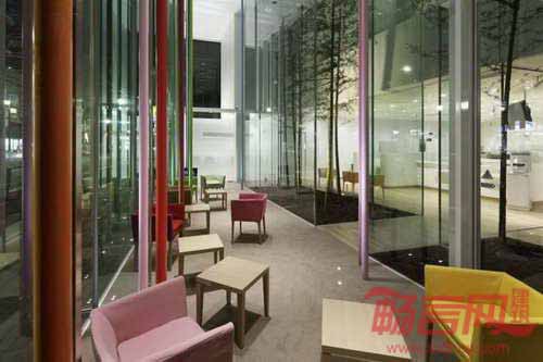 进入建筑后,参观者来到的是连接银行室内区域的室外庭院。庭院设计使得室内外区域再度融合。从玻璃庭院向内走,参观者会发现类似咖啡厅的开阔空间,感受到自然光照。庭院栽种的竹子向天伸展,与彩色杆子呼应。