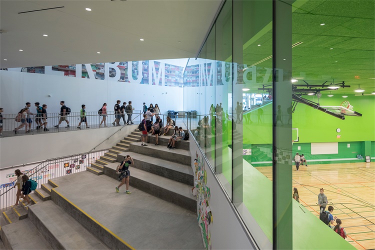 建筑师比雅克.英格斯表示,悬垂露台由一条弧形楼梯连接,楼梯贯穿所有楼层,并涉及室内和室外区域,使不分年龄和课程的学生都能够在视觉上交流,并近距离接触。每个平台都成为一道景观,不仅具有社交功能,还可作为非正式的户外学习场所。