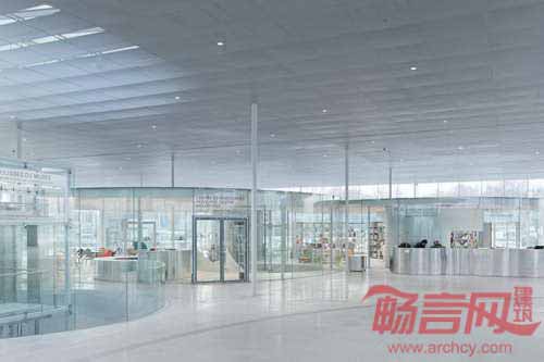 游客从玻璃中央大厅进入博物馆,弧形玻璃空间内包含了书店、咖啡厅和其他设施。