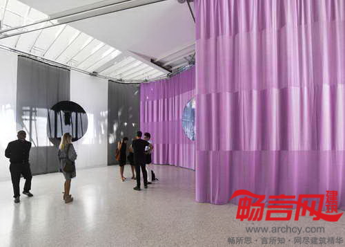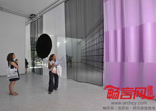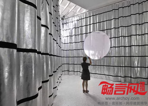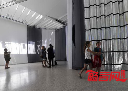 威尼斯双年展荷兰馆中,幕帘从天花垂坠到地面,将空间装扮一新。