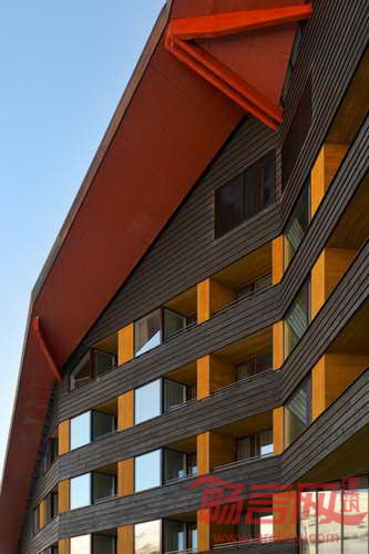 酒店轮廓灵感来自传统阿尔卑斯山木屋和美国山屋,酒店屋顶和平面依照周边现有建筑规模进行塑造。酒店覆盖了横向木板材,在视觉上使建筑尺寸更为小巧。