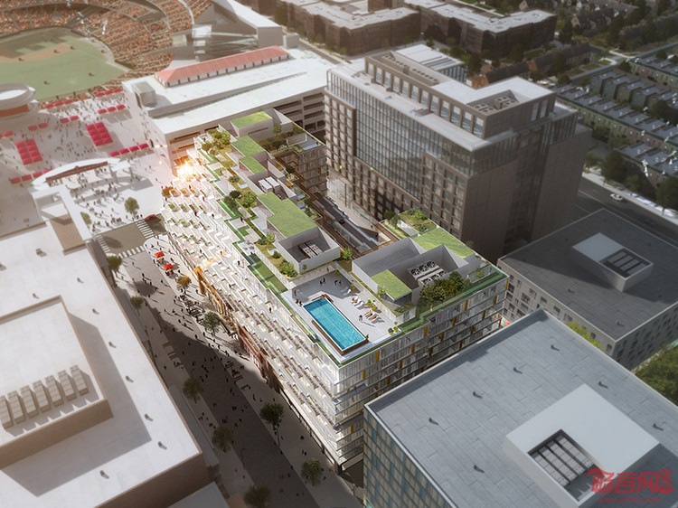项目建筑面积为456000平方英尺,设计上一方面与国家公园球场形成视觉对位,另一方面也寻求增强居民与周围社区的联系。