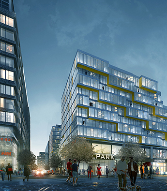 大楼共有11层,逐层向上形成一个斜面,与旁边阶梯形的国家公园球场形成呼应。楼内有50%的单元房配备了大观景阳台,而且地面两层为零售区。