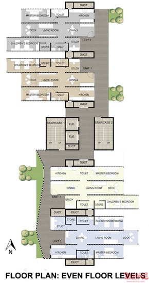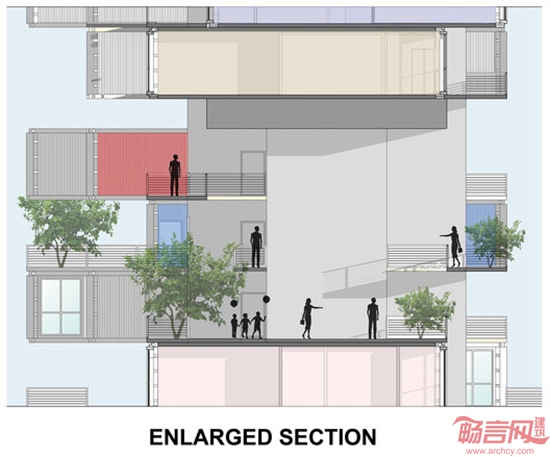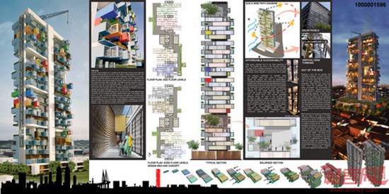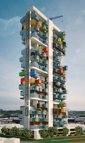 Ganti Asociates设计公司赢得了一项国际理念竞赛优胜。该公司除了一个集装箱摩天楼构想,为孟买Dharavi贫民区提供临时住宅。设计师考虑到钢制集装箱可以叠放到10层高,无需其他之城,因此创造了高度超过100米的高层建筑,主体由自支撑的集装箱组成,每八层由钢制格栅分隔。