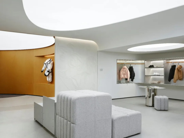 Canada Goose门店的设计核心概念为“无界”(boundless)——不仅追求美学,更传递冒险、探索与无限可能的精神,延续品牌标志性的视觉语言。Canada Goose巴黎旗舰店的立面采用了坚固的铝质覆层,灵感源自集装箱的实用主义语言——这些结构专为极地环境的耐久性而设计。这一材质与象征意义呼应Canada Goose的品牌基因,唤起在风雪冰霜中生存所需的坚韧。铝表面点缀云母颗粒,捕捉光影,仿佛阳光洒落在新雪之上,为工业感注入诗意的柔和。