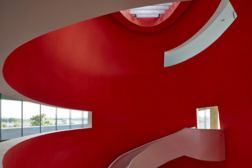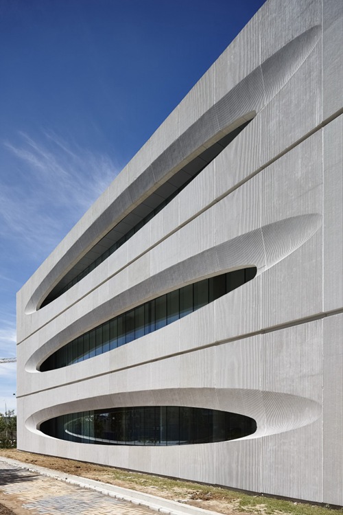 售楼处的外立面被均匀划分为三层,每层由一圈装饰混凝土轻型外墙板包裹内层的挑廊。每层外墙板中间均开一个横向椭圆形洞口,洞口部位是一个向内凹陷的不规则曲面,它为每层的挑廊以及建筑室内提供自然采光。
