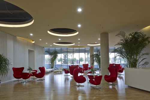 建筑地上三层,地下一层。地上首层、二层为销售用房,三层为开发商办公用房。地上三层空间通过一个桶状的中庭上下贯通,中庭顶部有天窗采光,形成建筑空间上的核心。首层和二层通过中庭内一个精心设计的钢制旋转楼梯进行沟通,方便了购房者的参观。同时,地上三层每层都在建筑四周设计了开敞外廊,购房者和开发商可以站在外廊观看工地情况。