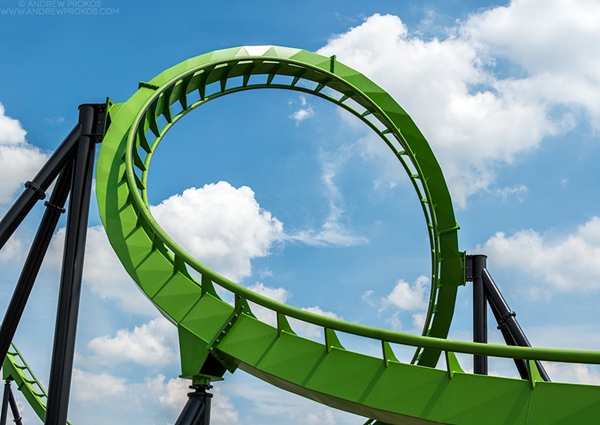 图片向人们展示了建筑物极富吸引力的外形和绚烂的色彩,各种欢乐元素在活力四射氛围中更加凸显。过山车轨道,各种惊险游乐项目以及小卖部都涂抹上了缤纷色彩,使得建筑物在游乐场中格外显眼。这些人工建筑聚集在一起,仿佛带领人们进入另一个世界。各种旋转惊险游乐项目,例如“一触即发”,“超人”,“非凡”等,抽象的结构在空中纵横交错,让人一眼就能被吸引住。