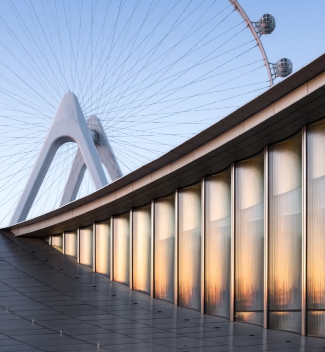 建筑幕墙采用国内首例双银Low-E超白弯弧玻璃。起伏的屋顶与回廊则由暖色调不锈钢面板精密打造,远观连续平滑,近看如折纸般纤薄。