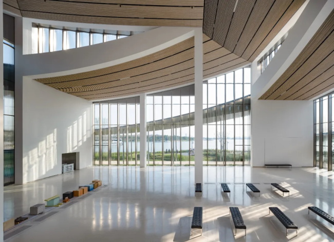 设计理念根植于苏州园林传统,从“廊”、“亭”、“院”中汲取灵感,将体量拆解为九个独立的展馆,再通过通透的玻璃廊道优雅串联,编织出一个庭院与展厅交织的游览网络。建筑如植物根茎般向湖岸延伸,创造出一步一景、移步换景的沉浸式艺术体验。