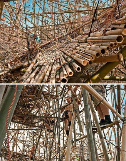 在意大利威尼斯大运河末端,有一座竹塔似乎是在一周时间之内突然长出来一样。这座建筑名为大竹子雕塑,是一个50英尺(约合15米)高的空心竹塔,似鸟巢状,有一个螺旋式坡道通往顶点的天台。整个搭建工程全部靠手工完成,共使用了大约3000根竹竿。