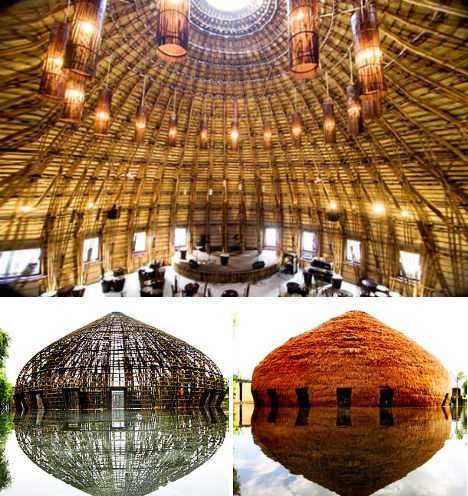 水与风咖啡馆位于越南平阳省境内,由Vo Trong Nghia建筑公司设计。这座令人难以置信的竹制建筑几乎完全用竹子建造,没有使用一根钉子。咖啡馆整体建筑呈半球形,灯光从屋顶打下,提供室内照明。建筑师采用越南传统的竹编技术将每一根竹子完美地结合成一个整体,屋顶覆盖物为当地的一种灌木植物。