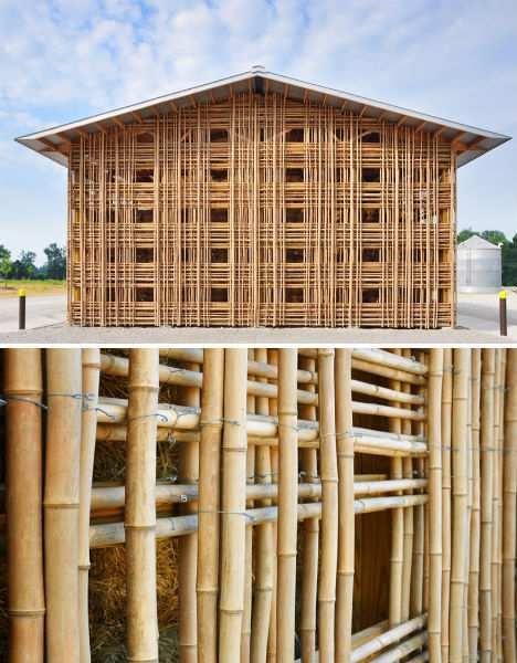 这座竹制建筑并不是位于盛产竹子的亚洲或热带,而是美国印地安那州戈申市。这是建筑师德-里昂参加2010年世界建筑节的展示作品。农舍可以用来存放农具、干草以及其他物品。竹屋以一种栅格风格搭建,并使用镀锌钢丝捆绑竹竿。墙壁上留有许多窗户,可以促进空气流通。