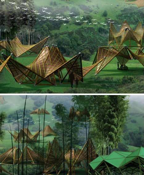 这种竹制折叠房屋目前仅仅处于设计概念阶段,设计灵感来自于折纸手工。这种房屋特别适合地震等大灾难后的临时避难所。2008年的中国大地震促使建筑师绞尽脑汁地去设计一种廉价的、易于建造的、环境友好形避难所。这种预制房屋可以快速地搭建和回收。
