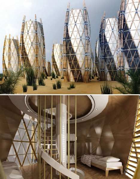 这种垂直竹制建筑可以为像海地这样的贫困国家在大灾难后提供廉价住房。茧状房屋由圣瓦尔建筑师事务所设计,每一栋房屋均采用竹竿支撑和X形金属接合形成外框架,实现高科技与天然材料的完美结合。一个螺旋楼梯围绕中间一根支柱盘旋而上,外围采用帆布密封。