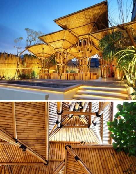 这座伞状竹制建筑是印度尼西亚雅加达一家日本户外面馆的主体建筑,该建筑的设计理念就是易拆解的临时性建筑。每一把巨伞相互之间交迭,可以为客人遮住阳光,挡风避雨。雨水通过竹竿之间的水槽汇入建筑中心的下水管道排走。