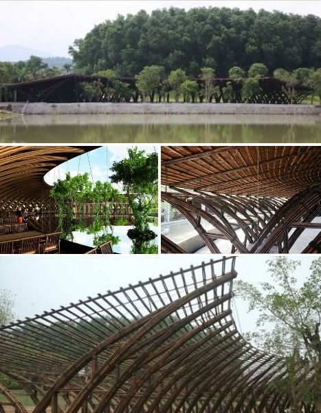 这座鸟形竹制建筑也是由Vo Trong Nghia建筑公司设计,主要用于时装表演、现场音乐会以及其他公众活动。鸟形剧场位于一个池塘旁边,主要采用竹子和绳索搭建,没有使用任何金属或其他木材,材料的选择充分体现了环境友好型建筑的特点。