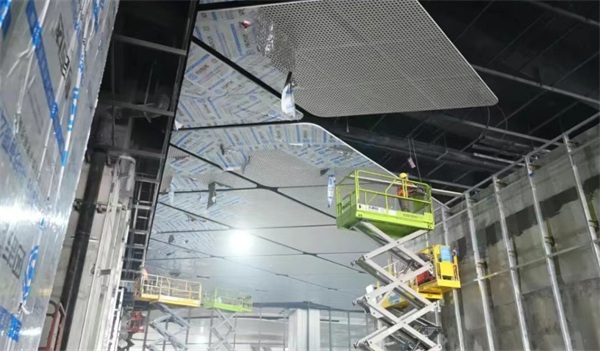 四吉达为项目提供冲孔铝单板吊顶、内装异形铝单板、花瓣形双曲包柱及蜂窝板的一体化解决方案。团队采用三维激光扫描与犀牛建模技术对双曲面包柱的花瓣形态进行数据采集,并结合建筑力学与曲面造型要求对参数进行优化。制造环节中,使用双曲无模多点成型仪处理复杂曲面,将单元板块间的尺寸误差控制在0.5毫米以内。同时,采用环保喷涂工艺对铝板进行表面处理,提升材料的耐候性能。