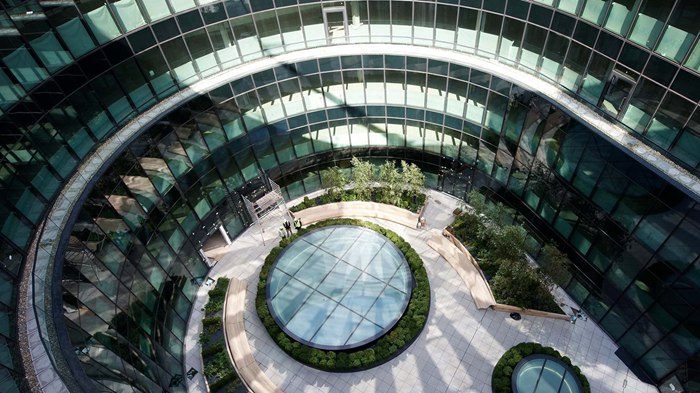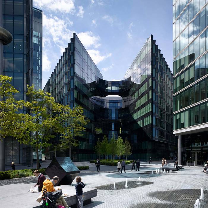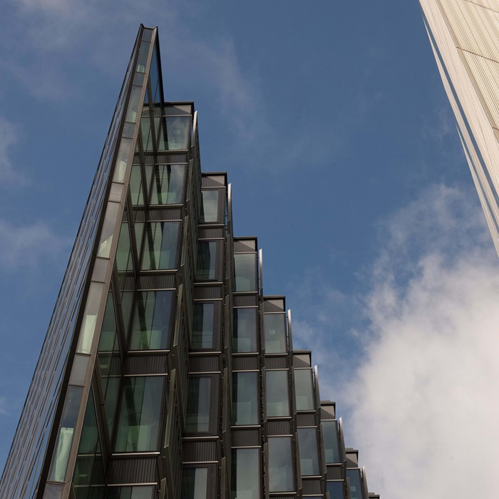 莫尔伦敦滨水区7号(7MoreLondonRiverside)是莫尔伦敦(MoreLondon)总体规划中最后也是最大的一座建筑,这座可持续的10层建筑将作为普华永道会计师事务所(PricewaterhouseCoopersLLP)的新总部。该建筑采用了一系列节能策略。除了专为遮护和保温隔热而设计的高性能立面,该建筑还安装了太阳能热水器面板、绿化屋顶和全自动建筑管理和计量系统。借助冷热电三联供(CCHP,CombinedCoolingHeating&Power)装置,以较低的碳源提供冷热电三种能源,并且使二氧化碳排放量比2006年建筑规程第L2部分(2006PartL2BuildingRegulations)的规定减少55%。该建筑从任何角度看去都清晰可见,没有明显的"正面"或"背面"之分,为了让其成为总体规划中的独特一笔,立面的设计经过了特别考量。"之"字形立面不仅可为室内提供遮蔽,还能让阳光充分洒进办公楼。一连串外置百叶窗可巧妙捕捉和投射光线和色彩,令建筑的玻璃立面闪闪发光、充满活力。为了进一步充分利用阳光、拓宽视野,该建筑的两座对称翼楼向河边敞开,显露出核心位置的开放式圆鼓结构。借助第2、5和8层的三座曲线桥将两座翼楼连通起来,同时南立面降为7层,避免妨碍沿图雷大街(TooleyStreet)的建筑的视野。三层高的内部中庭作为大楼使用者的中央广场,可在这里举办艺术活动,而升降梯和桥梁的布置正是莫尔伦敦滨水区室外生活的真实写照。乘坐自动扶梯可到达设有客户会议室和娱乐设施的夹层,升降梯可将员工直接从地下一层送到各个办公楼层。两个天窗为整个空间提供充足的自然光,同时也作为上方圆形景观露台(即若干屋顶花园中的一个)的中心。除了较低的南立面采用绿化屋顶之外,该建筑还在其他区域使用了粗石屋顶,战时伦敦曾借助这种屋顶吸引鸟儿栖居,但是后来因现代发展所需被取缔。