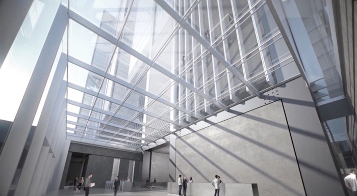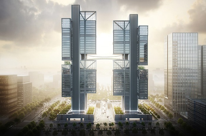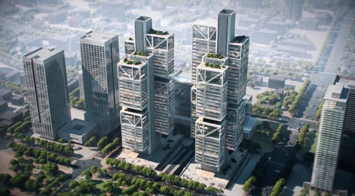 福斯特事务所提出了一个双塔方案,期望在研发空间、办公空间、公共空间等分配上取得平衡。每个塔的核心筒都以巨型钢架支撑,由六个玻璃体量依附其中达到悬浮效果,并在室内以宽敞无柱的空间提供了最大的办公灵活度。