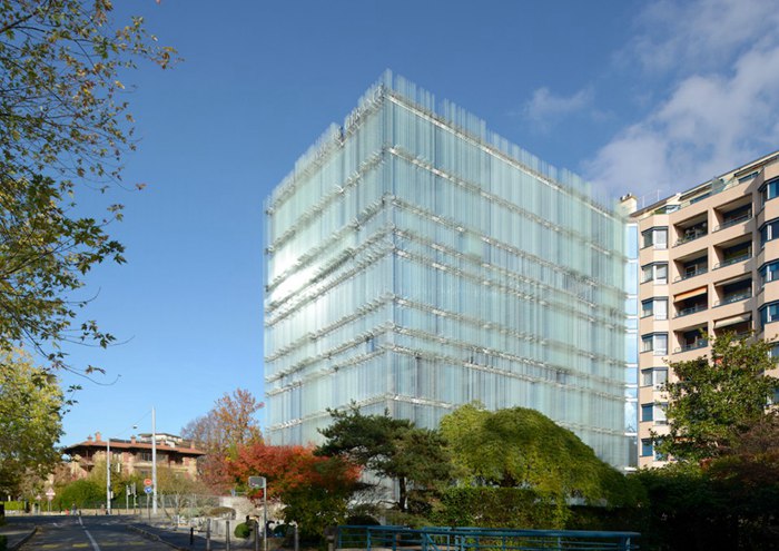 由于原有建筑本身的结构限制,为了在其表面安装重达100吨的玻璃,必须将立面的整体重量控制在最小。StahlbauPichler为该项目设计了一套特殊的工程系统,让构成建筑表皮的“玻璃叶片”可以自成一体,最大程度减少视觉上的阻碍,增强立面的精确性和整体性,同时满足了建筑的力学和美学需求。