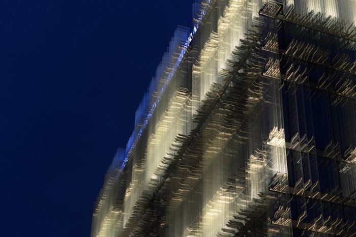 立面由三层玻璃和一个含有穿孔遮阳板的通风层构成,外侧设置由印刷玻璃制成的遮阳百叶,形成了富有变化的立面模块图案。遮阳板上的印刷图像增强了立面的混响效果,使建筑表面变得更为柔和,如同一团明亮的星云,仿佛随时都会消失。