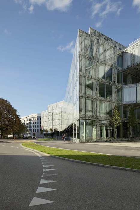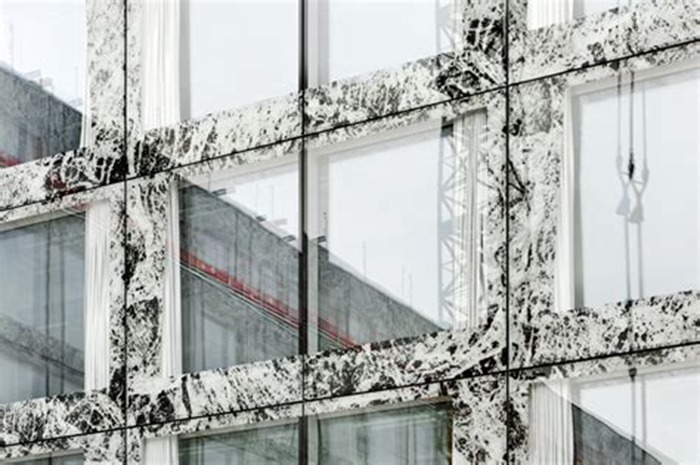 在总体规划中,要求这个区域的所有建筑外立面都为天然石材。建筑师依旧选择了玻璃幕墙作为大楼的外立面,但在同时,建筑师别出心裁的将密斯凡德罗的巴塞罗那馆上的石材纹理抽象化,通过烧结技术使之出现在玻璃上,形成类似天然石材的效果。这使得建筑既尊重了周边的环境,符合法规的要求,同时也与众不同。外立面由许多小单元组成,每个单元都包含一个封闭的中空系统,这个空间中悬挂着有计算机系统控制的铝涂层银色窗帘,这些窗帘将根据外部环境变化,由计算机智能系统控制其的开关闭合。