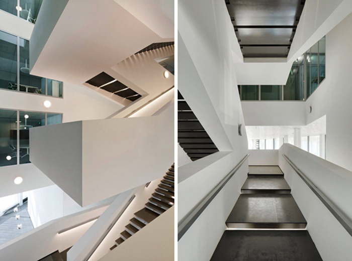 大楼的入口大厅和地面层都公共开放,保证建筑内部连续并与地面广场成为一个整体,中央大厅的电梯可以直达20层。咖啡厅和餐厅设置在5楼,而不是大堂。这样做是为了在公共和非公共的区域之间构筑一个缓冲区。5楼以下是对外会议室和临时外部客户使用的区域,这种灵活的商业中心使得外部访客不需要电梯就能到达,因此区分出内部员工和外部访客的区域。