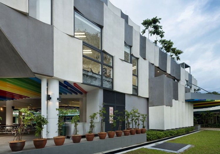 该建筑包括地面上一个带顶露天自助餐厅,能够容纳200名孩子就餐,由一个工业化厨房提供服务,代替了现有的熟食店,为校园提供平衡的餐饮。东边有一个下沉式游乐场地是该建筑的垂直流通堆叠区,由楼梯和电梯连接地下和地上部分。在二楼,建筑容纳了家长熟食店,还有一些其它与家长有关的设施,例如行政办公室、运输办公室、家庭教师学会会议室、统一商店和洗手间。