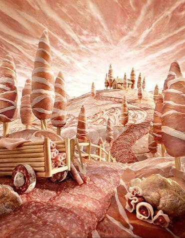 仔细一看,整片景色居然都是由大大小小的肉片、肉卷构成。虽然看起来有些油腻,但喜欢吃肉的人一定很喜欢这件艺术品。