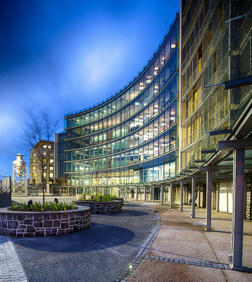 坐落于维多利亚与阿尔弗雷德海滨的第一Silo办公大楼于2013年完工,总价值约为十亿。绿色评级考察了多种集成创新。如灰水系统、用于节约饮用水的低流量配件等。建筑内制冷机的热能用于水的加热。海水则作为冷却装置的一部分用于吸收热量。