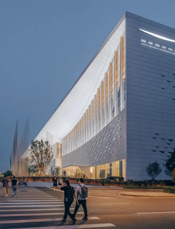 设计哲学旨在创造“庄严但不沉重、宏大却不压迫”的聚会场所。建筑以水平舒展的姿态融入环境,融合了东方的礼序精神与当代的开放姿态。核心元素是横贯南北、两端微微起翘的现代“飞檐”:既是中国传统建筑“反宇向天”意象的抽象转译,也是向世界展开的邀请函。