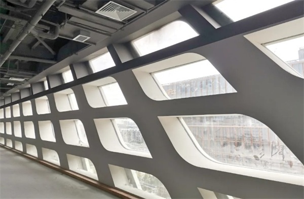 建筑内部采用GRG镂空大板装饰系统,工程量达3600平米。产品通过模具成型技术实现任意曲面造型,生产安装全程以1毫米精度进行,远超3毫米的通用规范标准。GRG板材兼具声学功能与艺术表现力,有效满足了建筑内部的隔声吸音要求。