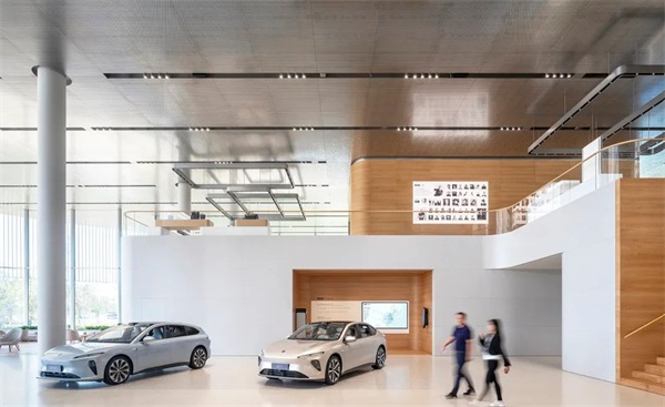 作为全球首座“零碳”蔚来中心,建筑屋顶铺满了光伏板,发电量实现了自给自足。为了减少碳足迹,设计师用不锈钢替换了90%的铝材,核心筒墙面用了可降解的软木板,从里到外践行“Blue Sky Coming”。建筑双层表皮颇具特色,内层是通透的Low-E玻璃幕墙,外层则覆盖着按斐波那契数列排列的不锈钢穿孔板,让阳光在室内投下梦幻的渐变光影。