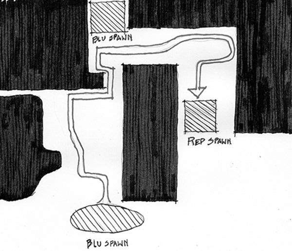 用方法论执行设计与在纸上或电脑上展开设计极为不同。方法论必须有草图,因此缺乏测量。草图练习能够让设计师在花时间衡量自己的设计版本之前,快速形成想法。关卡设计师方法论的关键在于像绘制空间图表一样勾勒出玩法理念。例如,之前提到的Badwater Basin关卡中的设计方法如果是在两者之间更狭小的区域中来呈现矿车轨道,以及BLU玩家可夺取的更小基地,那么它就会形成两个庞大的混乱场面。