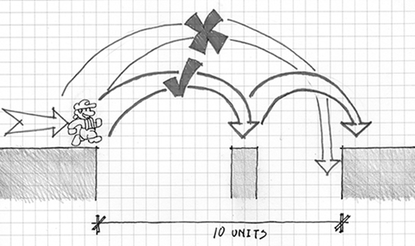 (《超级马里奥》中的关卡8-1令马里奥跳跃到极限。该鸿沟有10个街区那么宽,比马里奥所能跳跃的9个街区还要多1个街区,所以有必要采用一个宽1个街区的中间岛。多数穿过这种鸿沟的策略都需要玩家先跳到一个中间岛,然后再快速跳到另一个岛,这样马里奥的着陆惯性就不会导致玩家坠入深渊。