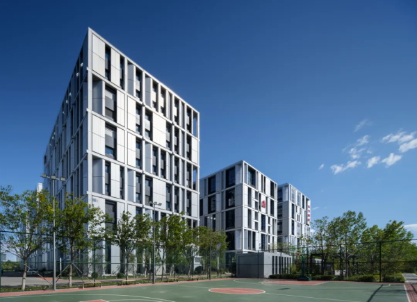 坐落于北京亦庄的东方雨虹新材料装备研发总部基地,项目投资8亿,设计打破了单层厂房的占地惯性,向垂直方向生长,通过分散式群组布局,消解了工业建筑的压迫感。东侧紧邻45米城市绿化带,西侧退让出活动空间,中间围合出中心庭院,“街区式”肌理让园区不再是封闭的孤岛,成为城市环境有机组成部分。