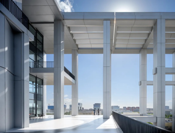 设计核心在于“模块化尺度”的层层演绎。设计建立了一套三维构架系统:以8.4米柱网为基底,将立面划分为基于层高和柱跨的基准模块。立面单元的建构不再仅服务于采光,而是融入了人的行为尺度,让冰冷的工业设施拥有了温暖的人性界面。